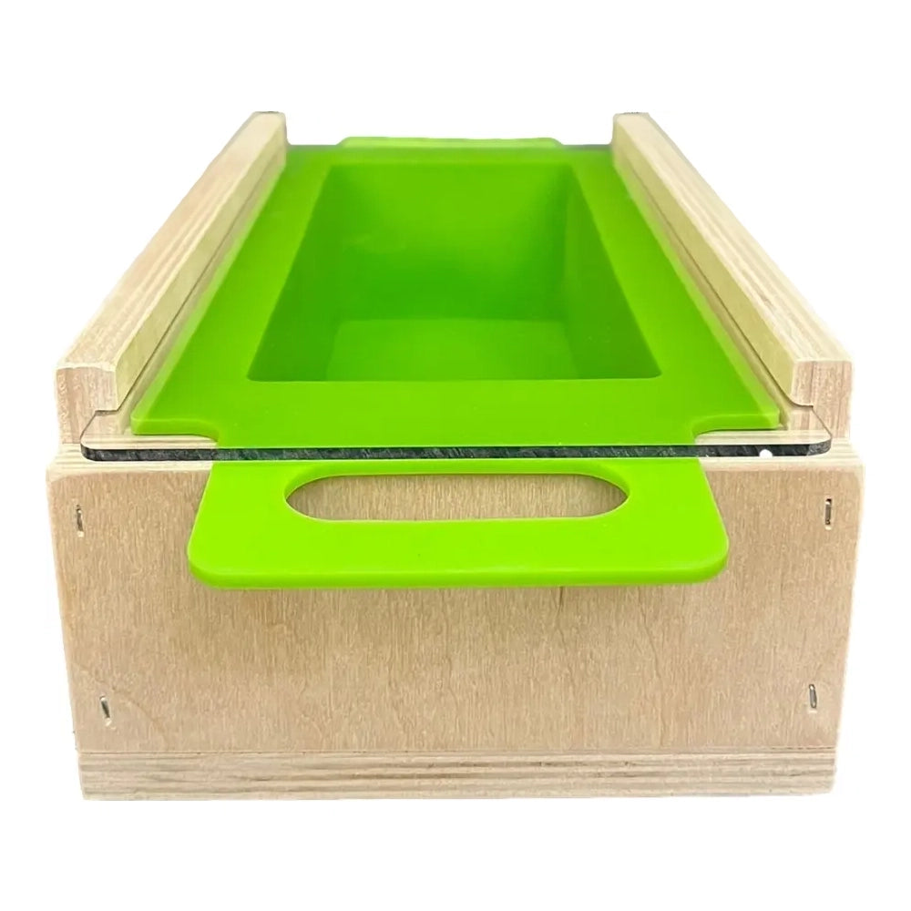 The 2.5 lb Handle Premium Mold is ideal for soap makers. The handles aid in removing the liner from the soap mold box and the silicone protects the wood on the sides. Additionally, the lid prevents air contact during soap gelling and reduces soda ash.