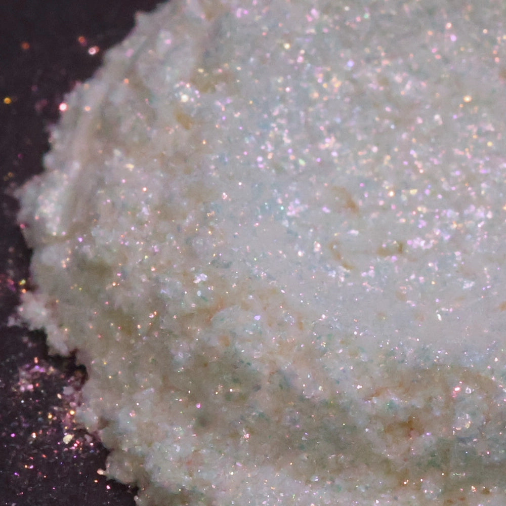 Winter Rose is a bright white, high micron, mica-based glitter that shimmers with red. When the light hits this mica just right, you can see the red glimmer that is hidden within the white. Unfortunately, this doesn't translate well to CP soap. Because CP is so opaque, the glimmer doesn't shine like it does in clear MP. Dusted on top, it leaves a mysterious red shimmer that absolutely gorgeous!